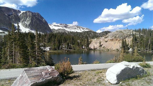 Noc bardzo ciepła mimo wysokości ponad 2700m. Spakowałem się jeszcze przed 7:00 i ruszyłem w drogę. Najpierw 200m.w górę potem 600m w dół. Zamiast jechać do Laramie znalazłem skrót przez Albany do Centennial. Droga szutrowa ale jechało się nieźle. W Centennial z braku sklepu i przeciągu w sakwach wstąpiłem do restauracji na śniadanie i 1.5L izotonika. W południe nogach było już ponad 55km a do przełęczy 19km i 800m w górę. Wychodząc z restauracji spotkałem Jasona. Urodzonego w Hong Kongu i mieszkającego po części w Tokyo i Denver chłopaka. Praktycznie do przełęczy jechaliśmy razem. Trochę pogadaliśmy, powymienialiśmy się informacjami. Droga do przełęczy znacznie się dzięki temu skróciła. Przełęcz Snowy Range Pass to muszę przyznać jedna z najładniejszych przełęczy które do tej pory zdobyłem w Górach Skalistych. Na jej szczycie znajduje się punkt widokowy na piękne i szerokie pasmo wierzchołka Medicine Bow Peak oraz na przeciwko rozległą panoramę na Wyoming i Colorado. Wydaje mi się, że przełęcz Snowy Range to najwyższa przełęcz drogowa Wyoming ale tą informację muszę jeszcze sprawdzić. Pierwsza zdobycz w Wyoming i od razu najwyższa ;) Na przełęczy pożegnałem się z Jasonem i zacząłem zjazd do miasta Saratoga w poszukiwaniu marketu. Zjazd trochę mi się dłużył. W pewnym momencie nawet tak zachciało mi się spać że aż musiałem się zatrzymać żeby nie zasnąć na siodełku. Do Saratogi zjechałem po 18:00, znalazłem market, zrobiłem zakupy i parę kilometrów dalej trafił się fajny nocleg bez rozkładania namiotu. Murowany, zadaszony punkt do obserwacji zwierzyny wodnej. Miejsce do siedzenia (leżenia, spania), widok na góry i jeziorko oraz schronienie przez wiatrem i prawdopodobnie deszczem. Nawet bardzo się zachmurzyło, może wreszcie spadnie trochę wody z nieba. Mimo bliskiej odległości że zbiornikiem wodnym o dziwo nie ma komarów które dokuczały mi przez ostatnie kilka dni.