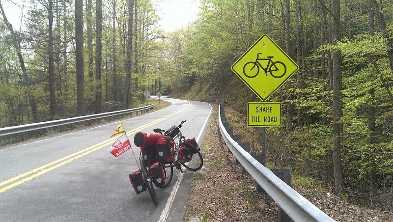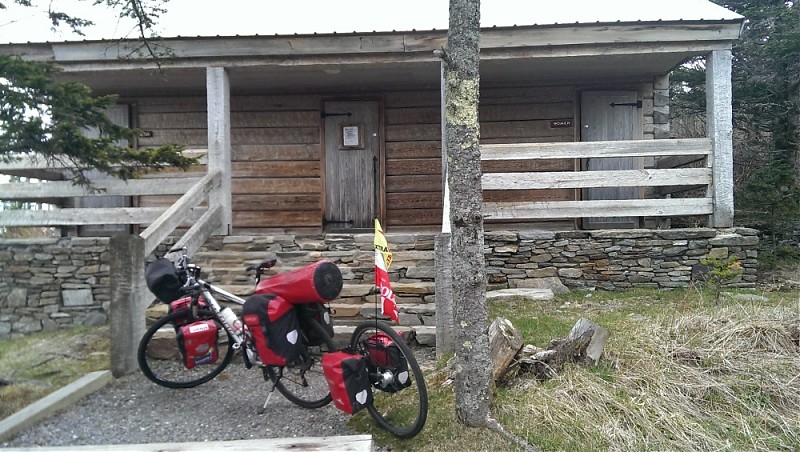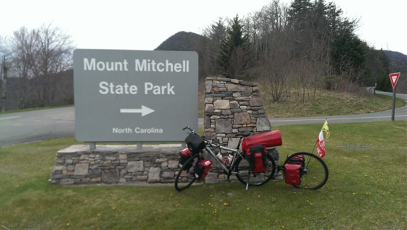 Z ciepłego i wygodnego łóżka zwlokłem się dopiero po 7:00. Przed ósmą oddałem klucze hinduskiemu małżeństwu, właścicieli motelu. Nie wiem czemu dostałem z powrotem 5USD po podaniu kluczy. Wspominałem, że byłem w zeszłym roku w Indiach i bardzo ich to ucieszyło ale myślę, że to nie był ten powód. Może takie zasady, jak by nie było 5 dolców wróciło czyli nocleg kosztował mnie w sumie 15 dolarów :) Do Mount Mitchell, mojego pierwszego ważnego celu podróży miałem około 118km i wcale nie planowałem zdobyć go na raz, choć taka myśl przeszła mi przez głowę. Do Marion, miasta z którego odchodzi droga na szczyt dojechałem po 13:00 i już w nogach było 75km. Zakupy, lody w McD, WiFi, maile, wysłanie zdjęć i 14:30 ruszyłem w górę z wysokości około 400m npm. Droga prowadziła mnie sama z niewielką pomocą GPS. Cały dzień numerem 70, potem 80 i z wysokości 1000m zaczęła się przyjemność jazdy górską drogą o nazwie Blue Ridge Parkway. Na BRP wreszcie spotkałem swoich... kilkuosobowe grupki kolarzy mijały mnie raz z góry, raz z dołu. Z niektórymi dziadkami i kobietami mogłem przez chwilę podjechać razem, pogadać. Z każdym kolejnym kilometrem czułem coraz większe zmęczenie. W formie jeszcze nie jestem, waga pomału spada i rozjeżdżenia jeszcze brakuje, przecież dopiero kwiecień a zima w PL trzymała długo. Co chwilę sprawdzałem wysokość na liczniku i godzinę. Jechało się i tak nie najgorzej choć co kilka kilometrów musiałem zrobić krótką przerwę. Według prognoz od jutro ma przejść deszczowy front nad górami więc dobrze by było szczyt zdobyć jeszcze dziś. Była na to realna szansa. O 18:00 byłem na końcowym rozjeździe dróg na wysokości 1600m a do szczytu już tylko 7km. Sam podjazd nie jest trudny. Z Marion to niecałe 50km i 1600m przewyższenia. Średnie nachylenie waha się pomiędzy 4-6% a maksymalne to z 10%. Droga jest przyjemna, asfalt niezłej jakości, po drodze jest też kilka tuneli i punktów widokowych. Niestety jutro będę miał na około. Dalsza część drogi od skrzyżowania na Górą Mount Mitchell jest zamknięta z powodu remontu. Czeka mnie więc zjazd do Marion i dodatkowo jakieś 80km. Czas ucieka, mi jedzie się coraz gorzej a na dodatek zaczęło się chmurzyć. Kilka kilometrów przed szczytem tablice informują o polu namiotowym i innych atrakcjach. Pomyślałem, że jak zdobędę szczyt to nie będę zjeżdżał w dół tylko przenocuje w legalnym miejscu. W końcu zrobiłem jeszcze inaczej. Zależało mi na fajnych fotkach na szczycie. A o półmroku i zachmurzonym niebie raczej takie by nie wyszły. Dojechałem więc do całego kompleksu turystycznego pod górą i znalazłem pole namiotowe. Na parkingu przed polem natknąłem się jeszcze na strażnika parku który siedział w samochodzie i pisał jakiś raport. Spytał tylko czy zostaję na noc i powiedział żebym uważał na niedźwiedzie i nie zostawiał jedzenia na wierzchu. Spałem już w wielu miejscach ale na takim wypasionym jeszcze nie. Na wysokości 1930m znajduje się kilka osobnych boksów na namioty z paleniskiem i drewnem na opał. Drewno płatne, ale miejsce na namiot darmowe. Jest również toaleta z wodą, światłem, prądem w gniazdkach i ciepłym nawiewem. Od razu wiedziałem gdzie będę spał. Po co mam rozkładać namiot, narażać się na zmarznięcie, zmoknięcie jak mogę spać w suchej i ciepłej toalecie. No i miśki mi nie straszne. Wybrałem damską, zamiast pisuaru była półka do przebierania dzieci a pod nią idealny kawałek na karimatę. W sumie brakuje tylko McD, WiFi i zasięgu ;) Nawiew trochę hałasował ale było ciepło. Na tej wysokości trudno o większy komfort za darmo. Podczas pisania tej relacji zaczęło padać. Tym bardziej się cieszę, że nie siedzę w namiocie. Do szczytu mam 1.5km, jeśli tylko pogoda rano pozwoli po 7:00 podjadę na szczyt a potem długi zjazd do Marion.