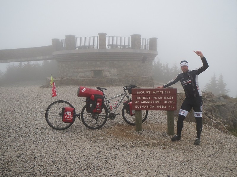 Wieczorem szybko zasnąłem, zmęczenie dawało znać o sobie, nie przeszkadzał mi nawet hałas nawiewu ani twarde kafelki. Obudził mnie budzik, 6:15. Wyjrzałem na zewnątrz, było mokro ale nie padało. Rano jeszcze czułem palenie w mięśniach i lekkie drżenia. Przebrałem się, zpakowałem i ruszyłem w górę. Po jednej mili byłem na górnym parkingu z którego prowadzi około 300 metrowa ścieżka "tylko" dla pieszych. Było przed siódmą, na górze nikogo prócz mnie więc nie będę przecież szedł z rowerem na szczyt. Wszystko pomyślane w taki sposób aby niepełnosprawni również mogli dostać się na sam czubek góry. Kilka minut potem byłem na Mount Mitchell, najwyższym szczycie Stanów Zjednoczonych na wschód od rzeki Mississippi, najwyższym szczycie całego pasma Apallachów oraz stanu Karolina Północna. 2037m czyli jakieś 6684 stopy wg tutejszych jednostek. Tym razem góra nie pozwoliła mi cieszyć się widokami z jej wierzchołka. Chmury i widoczność na 100m, popularne mleko. Pokręciłem się po szczycie, pocykałem fotki, poczytałem co nieco o Elisha Mitchell od nazwiska którego swoją nazwę wzięła góra i zacząłem zjazd w dół. Z każdym kilometrem było coraz ciepłej i coraz więcej dało się zobaczyć. Na szczycie były tylko 3st.C w Marion 14. Do kolejnego miasta Asheville miałem jakieś 40km. Nie sądziłem, że będzie mnie czekał na tym odcinku podjazd na prawie 900m i to po trzypasmowej drodze. Czwartym pasem, awaryjnym wciągałem się jaz prędkością 8-10km/h. Znów ten korony hałas ciężarówek i przerośniętych osobówek amerykanów. Po wczorajszej wspinaczce moje nogi dziś mocno protestowały. Kręciło się okropnie na dodatek zaczęło straszyć deszczem. Na zjeździe z przełęczy zaczęło kropić, im bliżej byłem miasta tym mocniej dawało z nieba. W końcu zatrzymałem się w fastfoodzie sądząc, że przestanie padać abym mógł jechać dalej. Nic z tego. Zaciągnęło na co najmniej do jutra. W TV coś mówili o tornado nad Houston. Nie było wyjścia. Musiałem znaleźć motel i przeczekać niepogodę. Najtańszy znalazłem 6km dalej. Założyłem kurtkę, ochraniacze na buty i po kilkunastu minutach byłem już w motelu. Prysznic, suszenie, kolacja, spać :)